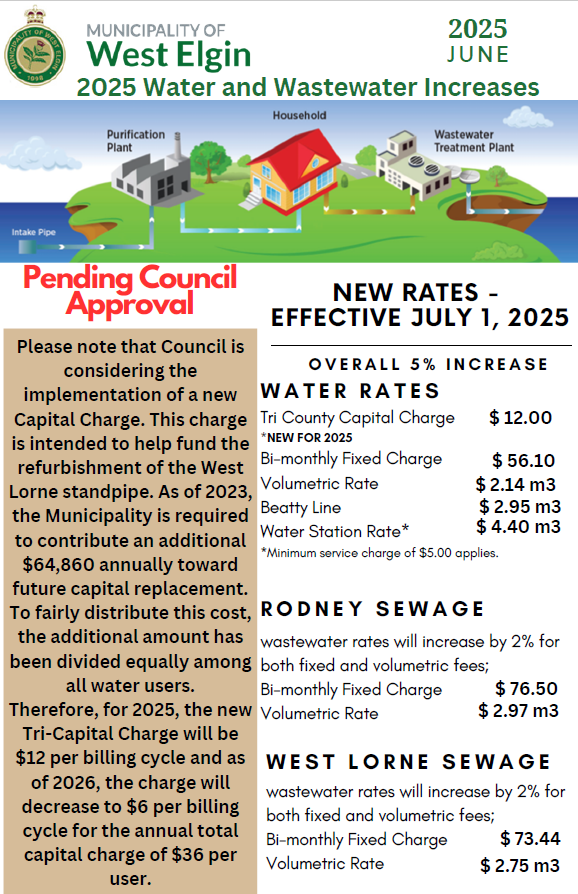 The Municipality of West Elgin's drinking water system is operated by the Ontario Clean Water Agency (OCWA). We have two separate sanitary sewer systems in the villages of Rodney and West Lorne. Our municipal drains improve the drainage of our community's agricultural lands.